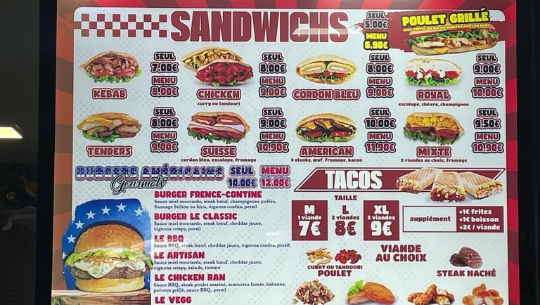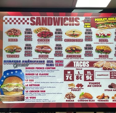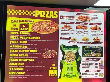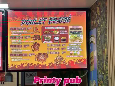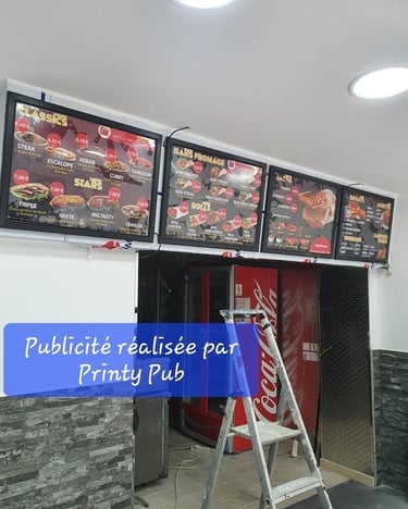 Chez Printy Pub, nous vous aidons à structurer votre menu (formats, nombre de panneaux, zones prix/photos, hiérarchie), supports résistants et solutions pensées pour durer. Résultat : une présentation claire, professionnelle et efficace en point de vente.